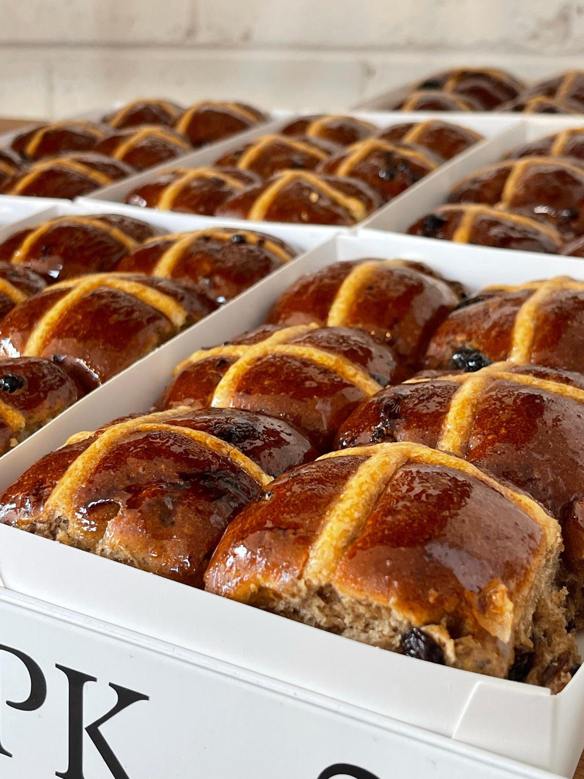 baked fresh every morning with muscatels, currants, orange peel, spiced glaze
